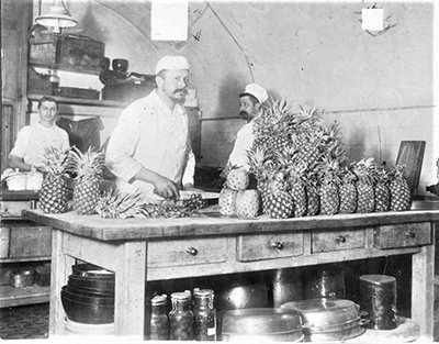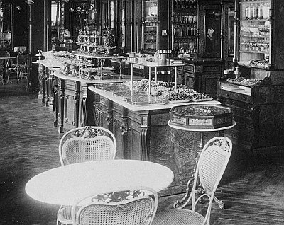 1. Ananászokkal díszített pult a Gerbeaud cukrászdában. Részlet Klösz György fényképfelvételéből a Gizella téri Gerbeaud cukrászda belsejéről (1900 körül) /Forrás: Fortepan/Budapest Főváros Levéltára.
